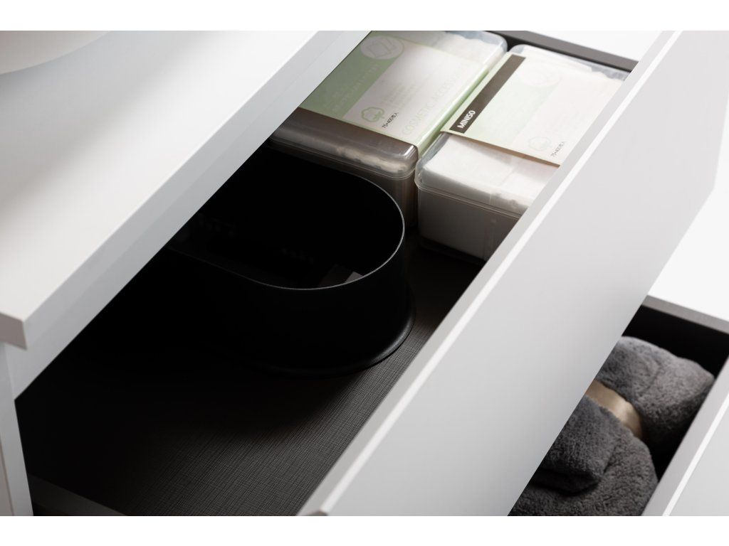 A szekrény falra szerelhető, és állítható szerelvényekkel van felszerelve, amelyek a szekrény testén a felső fríz alatt találhatók, lehetővé téve a magasság és a sík beállítását. A fiókban egy rejtett kivágás található a mosdó szifonjának beépítéséhez.