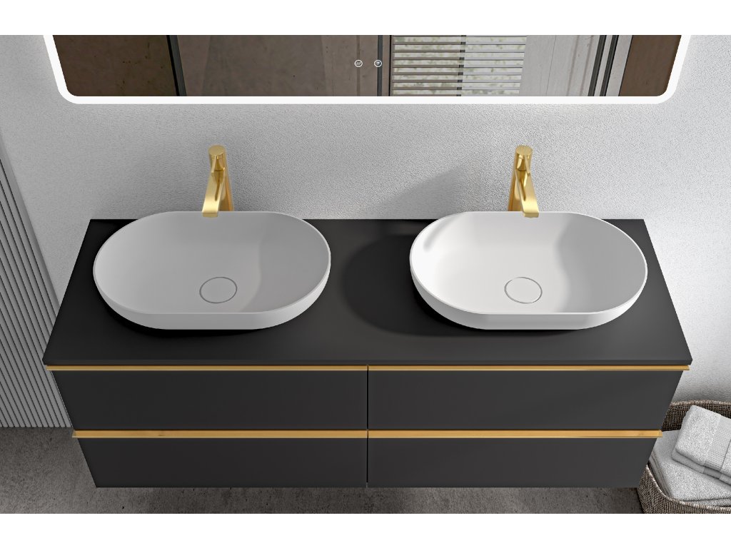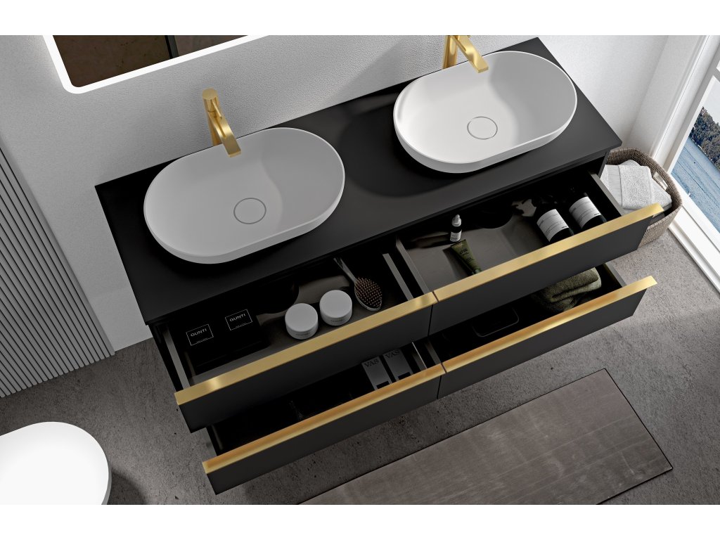 CERANO - Fürdőszobaszekrény mosdó alá Velora fogantyúval/mosdótetővel - 18 mm - matt fekete, arany fogantyú - 119x53x45,2 cm