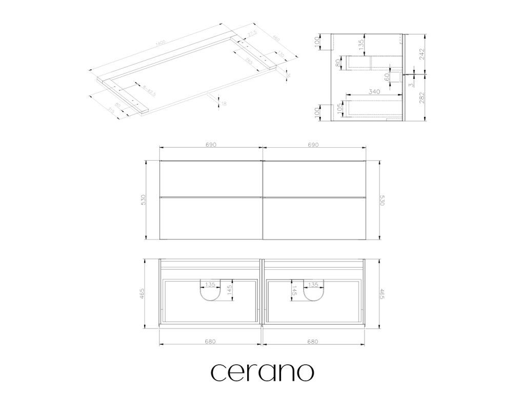 CERANO - Fürdőszobaszekrény mosdó alá Velora fogantyúval/mosdótetővel - 36 mm - matt fekete, fekete fogantyú - 138x53x45,2 cm