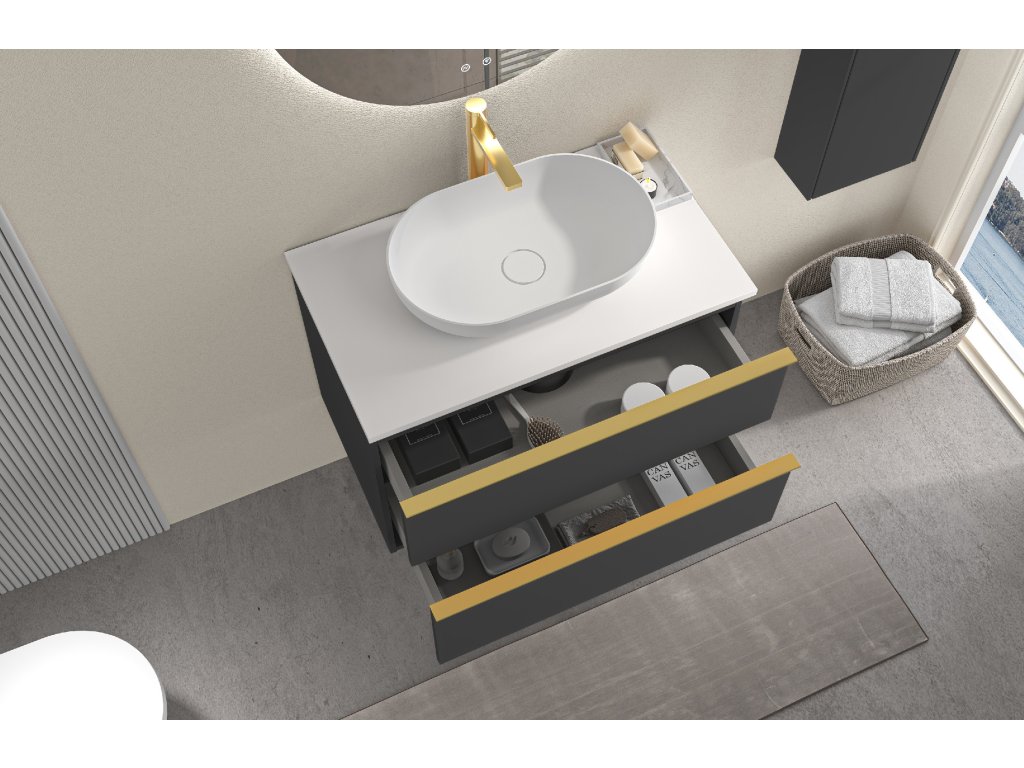 CERANO - Velora fürdőszobai mosdószekrény Elanys öntött márvány fogantyúval/tetővel - 12 mm - matt fekete, arany fogantyú - 69x53x46 cm