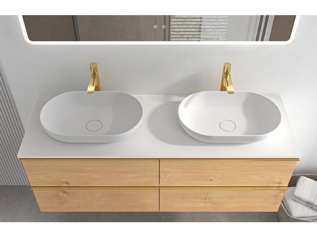 CERANO - Velora fürdőszobai mosdószekrény Elanys öntött márvány fogantyúval/tetővel - 12 mm - mézes tölgy, arany fogantyú - 138x53x45,2 cm