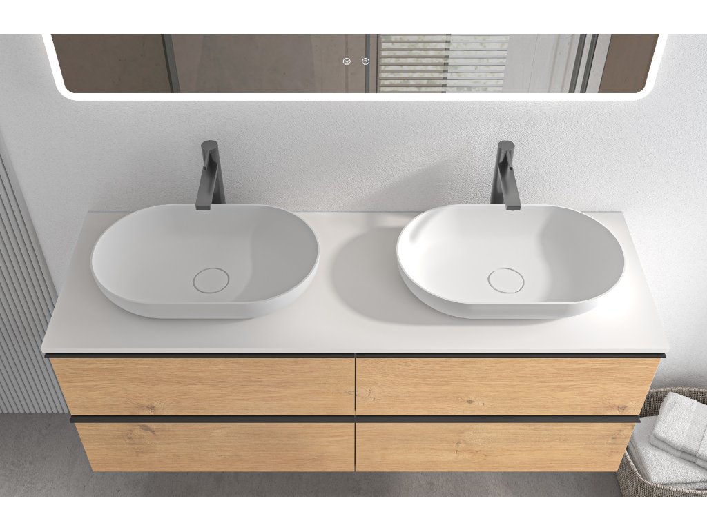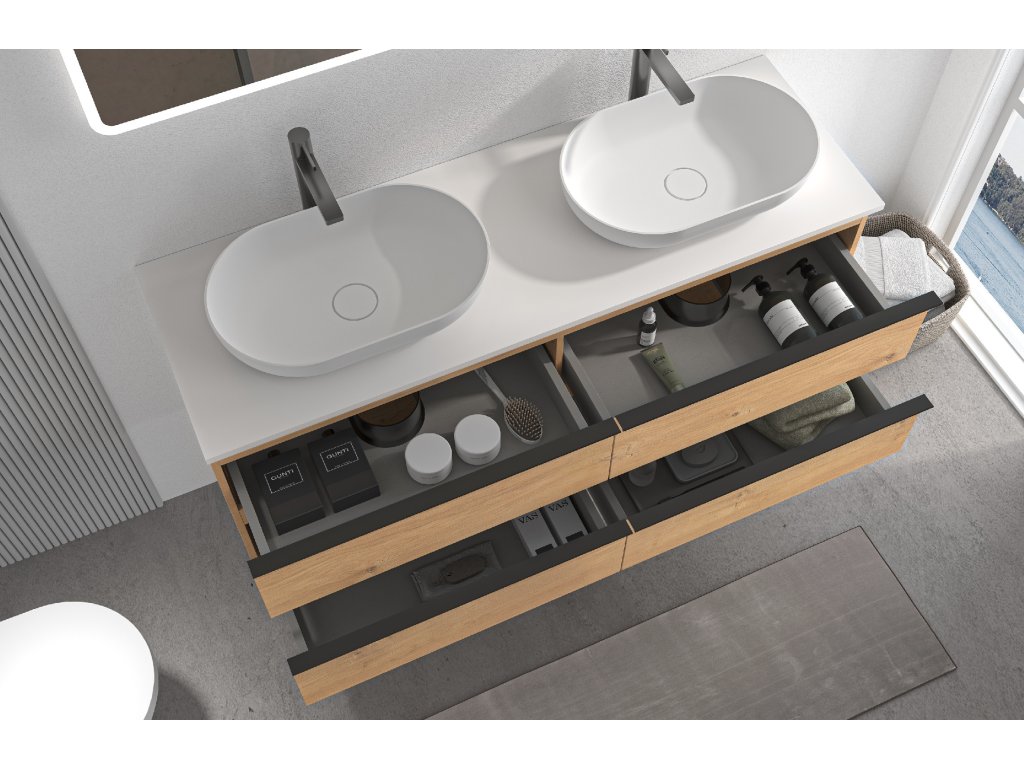 CERANO - Velora fürdőszobai mosdószekrény Elanys öntött márvány fogantyúval/tetővel - 12 mm - mézes tölgy, fekete fogantyú - 138x53x45,2 cm