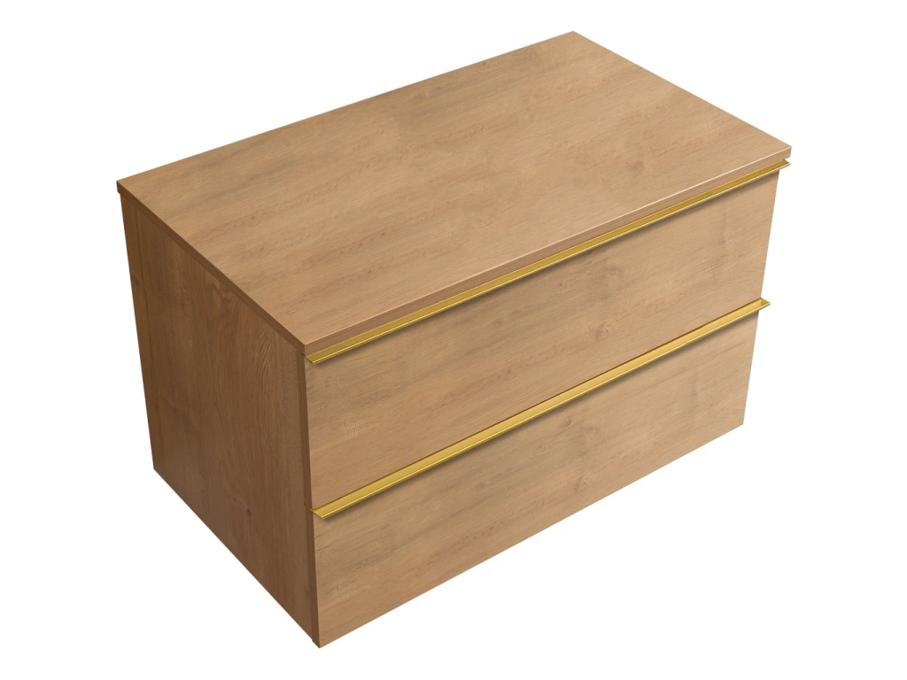 CERANO - Velora fürdőszobaszekrény - mézes tölgyfa, arany fogantyú + Navira Slim mosdólap - 18 mm - 80x54,8x46,5 cm
