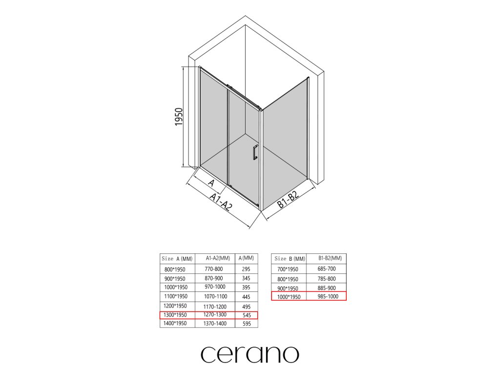 CERANO - Zuhanykabin Orlano B/J - 5 mm - matt fekete, átlátszó üveg - 130x100x195 cm - tolóajtó