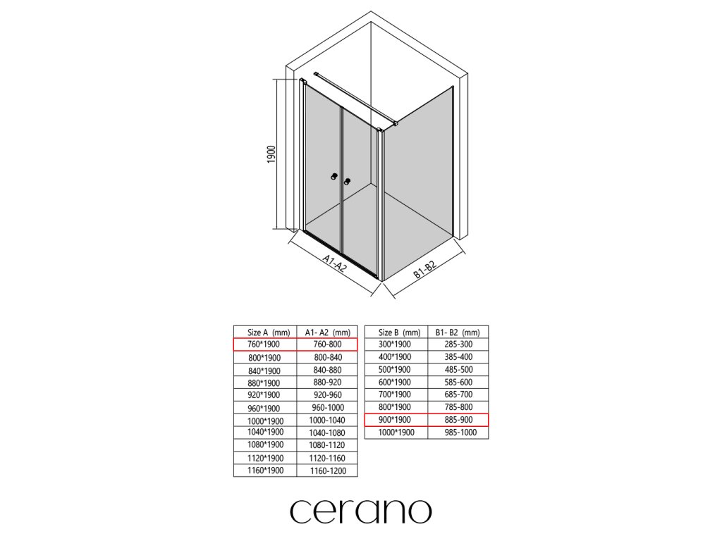 Ezen a sorozaton belül széles méretválasztékot kínálunk, hogy kielégítsük ügyfeleink különböző igényeit. Minden CERANO zuhanykabin, ajtó és paraván teljesen kompatibilis az azonos méretű CERANO zuhanytálcákkal , biztosítva a zökkenőmentes telepítést és a tökéletes összehangolást.