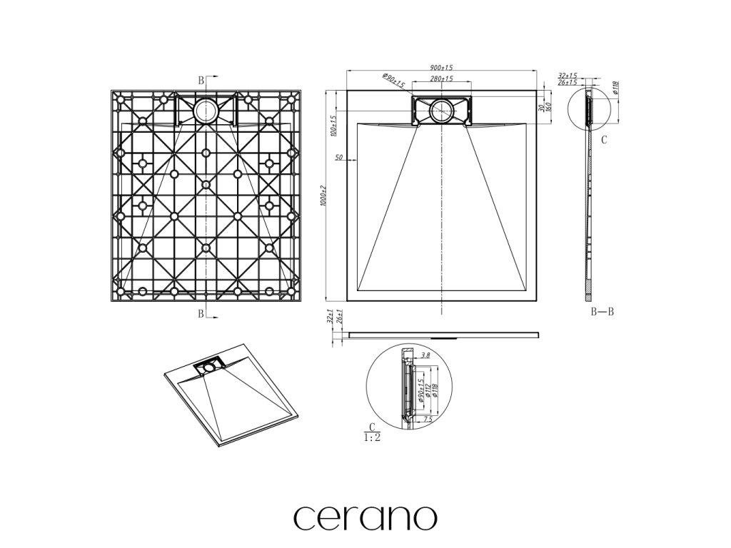CERANO - Téglalap alakú zuhanytálca Enzo - SMC/ásványi kompozit - strukturált fekete matt - 100x90x3 cm