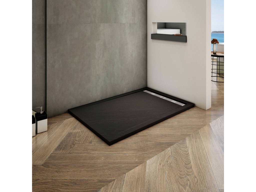 CERANO - Téglalap alakú zuhanytálca Docia - SMC/ásványi kompozit - szifon + rozsdamentes acél fedél - strukturált fekete matt - 160x80 cm