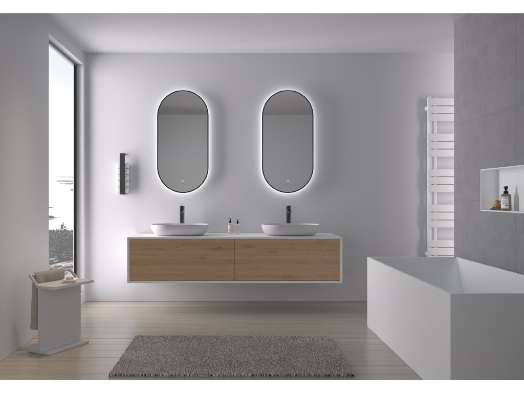 A tükör hátulról LED háttérvilágítással van felszerelve, amely a fal felé világít, és lágy fényhatást hoz létre a teljes kerület mentén. A szórt fény a keret és a tükör közötti térből indul ki, nem vakít, és biztosítja a fürdőszoba egyenletes és kellemes megvilágítását.