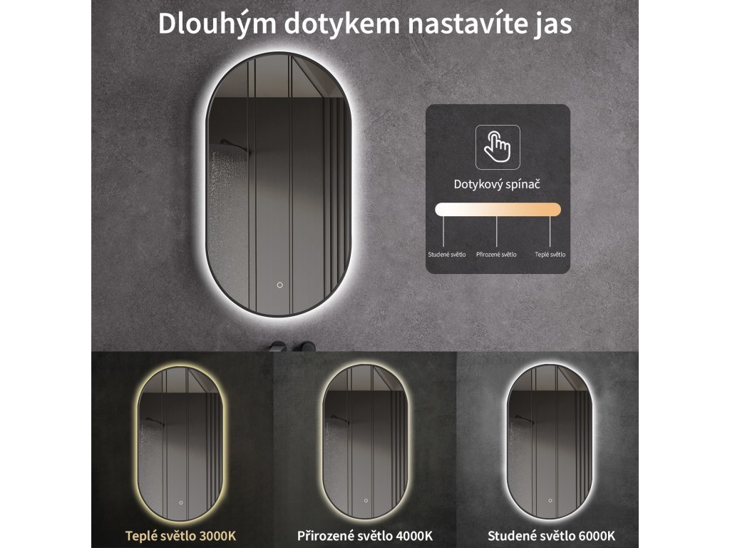 A tükör LED világítással van felszerelve, amelynek fényszíne állítható - 3000 K-től (meleg) 6000 K-ig (semleges). A színeket könnyedén válthatja a tükör felületén található érintőgombbal. Intenzív és erős fényt biztosít a részletes ápoláshoz, valamint kellemes, lágy fényt a pihenéshez. A széles színhőmérséklet-tartománynak köszönhetően könnyedén az aktuális igényeihez igazíthatja a hangulatot.