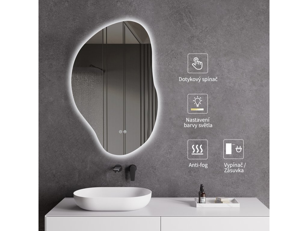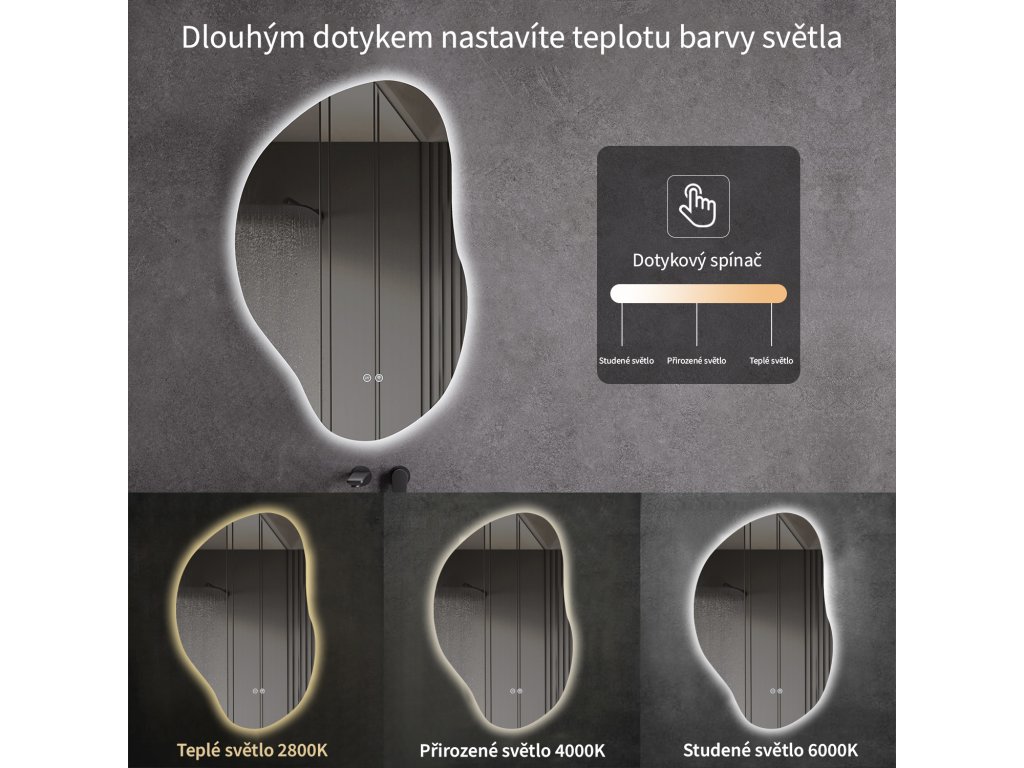 A tükör LED világítással van felszerelve, amelynek fényszíne állítható - 3000 K-től (meleg) 6500 K-ig (semleges). A színeket könnyedén válthatja a tükör felületén található érintőgombbal. Intenzív és erős fényt biztosít a részletes ápoláshoz, valamint kellemes, lágy megvilágítást a pihenéshez. A széles színhőmérséklet-tartománynak köszönhetően könnyedén az aktuális igényeihez igazíthatja a hangulatot.