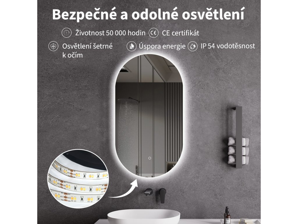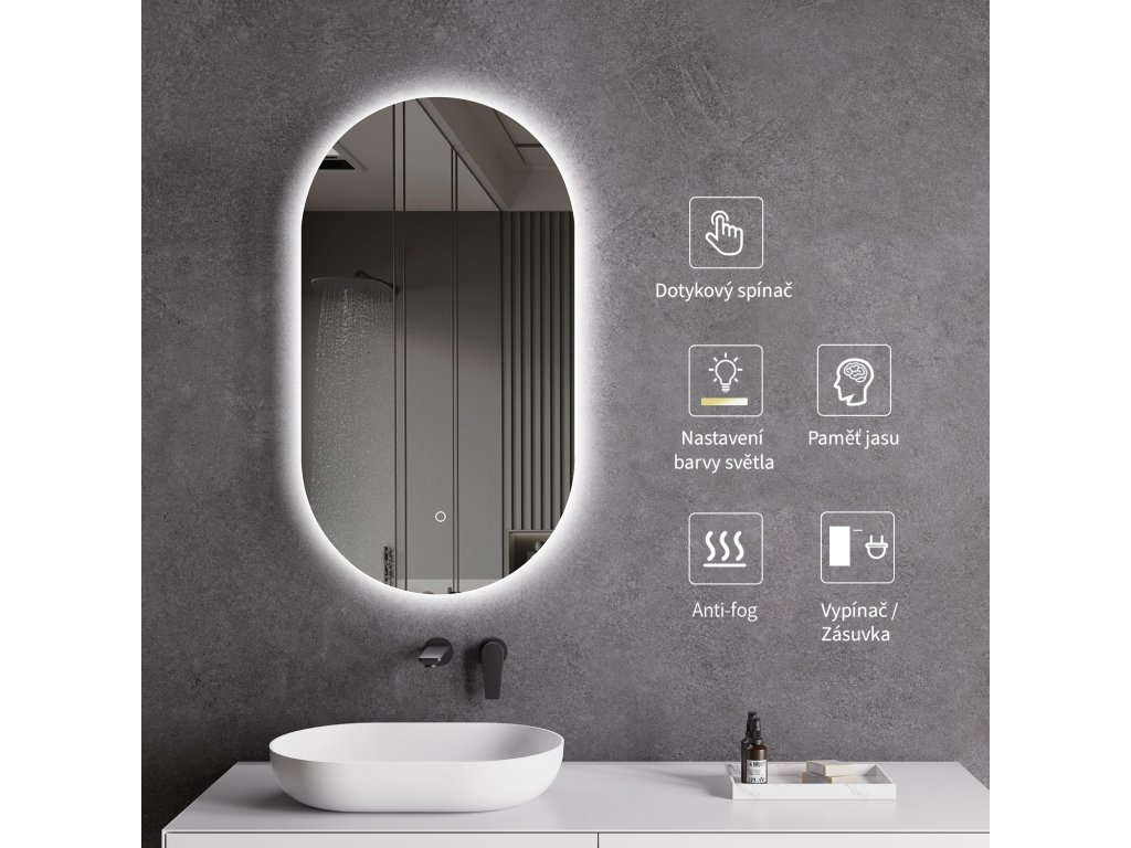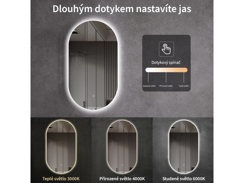 A tükör LED világítással van felszerelve, amelynek fényszíne állítható - 3000 K-től (meleg) 6000 K-ig (semleges). A színeket könnyedén válthatja a tükör felületén található érintőgombbal. Intenzív és erős fényt biztosít a részletes ápoláshoz, valamint kellemes, lágy fényt a pihenéshez. A széles színhőmérséklet-tartománynak köszönhetően könnyedén az aktuális igényeihez igazíthatja a hangulatot.
