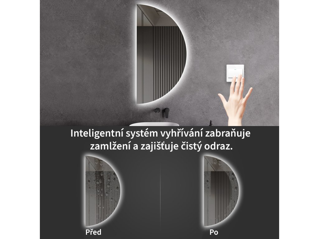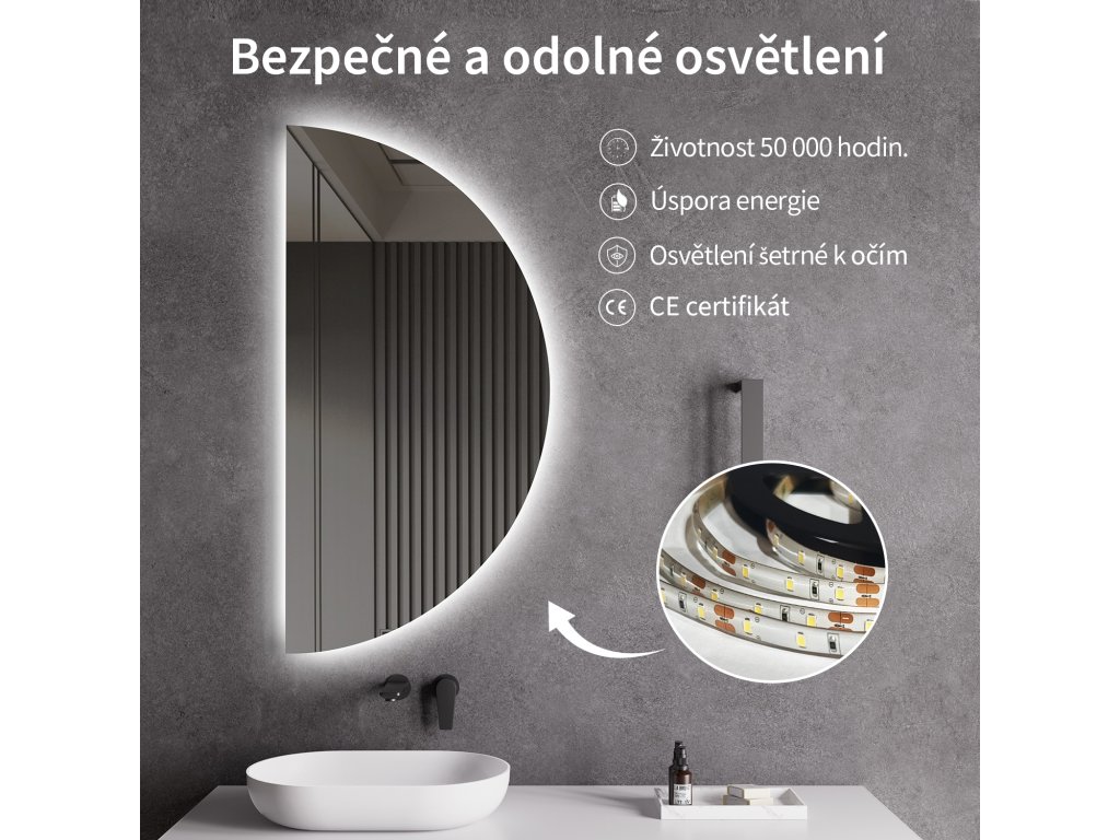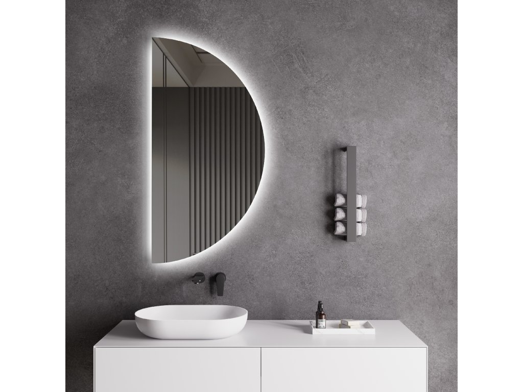 A tükör hátulról LED háttérvilágítással van felszerelve, amely a fal felé világít, és lágy fényhatást hoz létre a teljes kerület mentén. A szórt fény a keret és a tükör közötti térből indul ki, nem vakít, és biztosítja a fürdőszoba egyenletes és kellemes megvilágítását.
