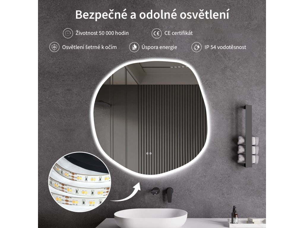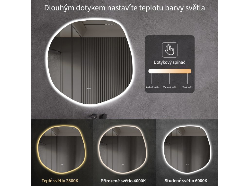 A tükör LED világítással van felszerelve, amelynek fényszíne állítható - 3000 K-től (meleg) 6500 K-ig (semleges). A színeket könnyedén válthatja a tükör felületén található érintőgombbal. Intenzív és erős fényt biztosít a részletes ápoláshoz, valamint kellemes, lágy megvilágítást a pihenéshez. A széles színhőmérséklet-tartománynak köszönhetően könnyedén az aktuális igényeihez igazíthatja a hangulatot.