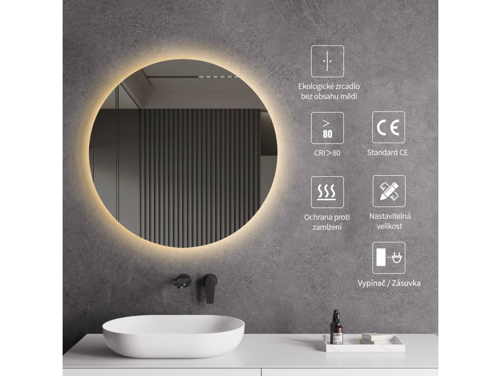 A tükör hátulról LED háttérvilágítással van felszerelve, amely a fal felé világít, és lágy fényhatást hoz létre a teljes kerület mentén. A szórt fény a keret és a tükör közötti térből indul ki, nem vakít, és biztosítja a fürdőszoba egyenletes és kellemes megvilágítását.