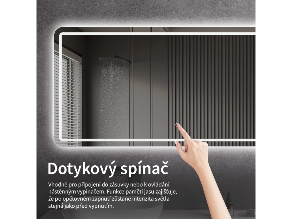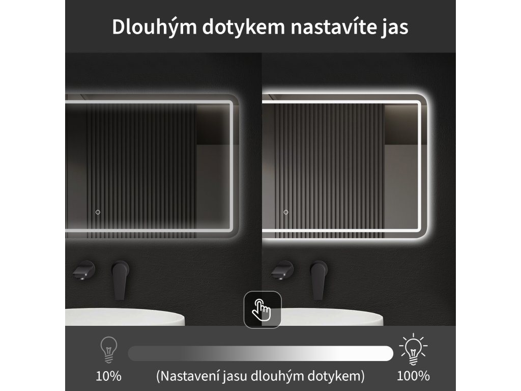 A LED-es tükör fényerőszabályzóval rendelkezik, amellyel pontosan beállíthatja a fény intenzitását. Egyszerűen érintse meg az érzékelőmezőt a lámpa be- vagy kikapcsolásához. Tartsa az ujját a kívánt fényerő beállításához - a fény folyamatosan növekszik vagy csökken, hogy mindig az Ön igényeinek megfelelő ideális megvilágítást biztosítsa.