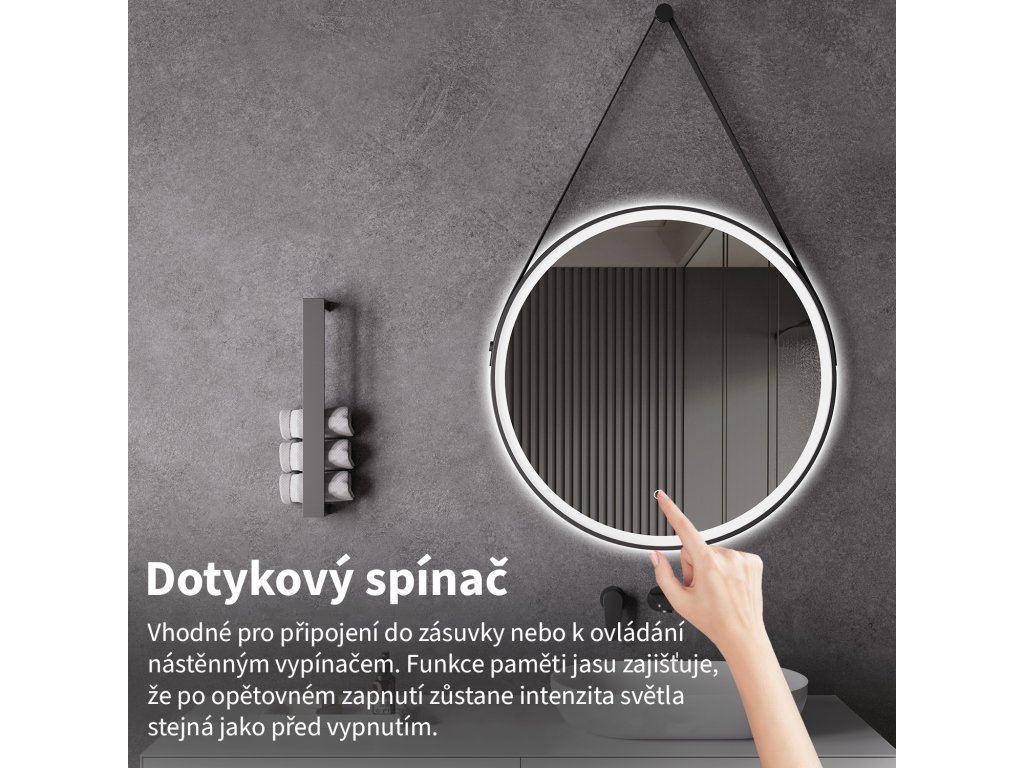 A LED-es tükör fényerőszabályzóval rendelkezik, amellyel pontosan beállíthatja a fény intenzitását. Egyszerűen érintse meg az érzékelőmezőt a lámpa be- vagy kikapcsolásához. Tartsa az ujját a kívánt fényerő beállításához - a fény folyamatosan növekszik vagy csökken, hogy mindig az Ön igényeinek megfelelő ideális megvilágítást biztosítsa.