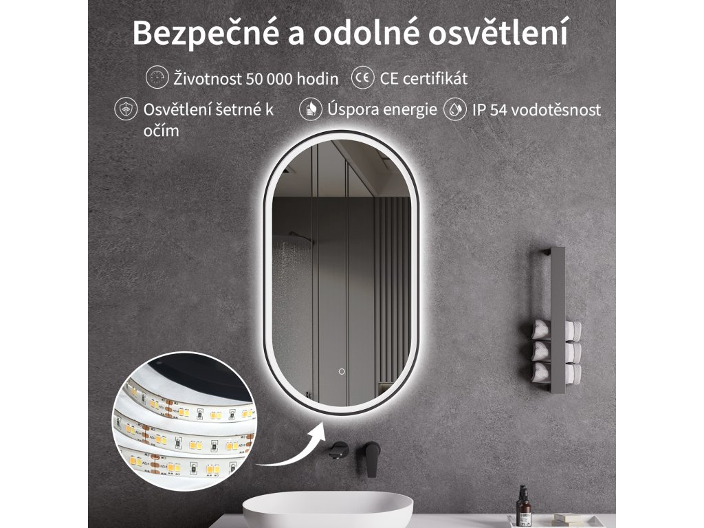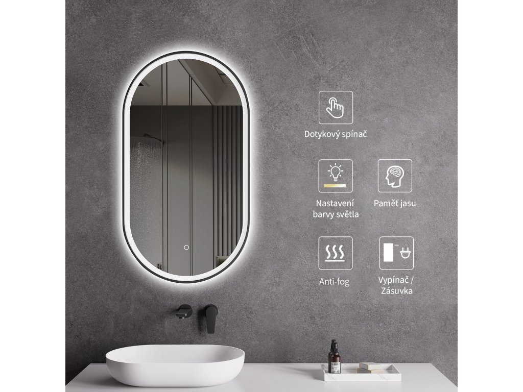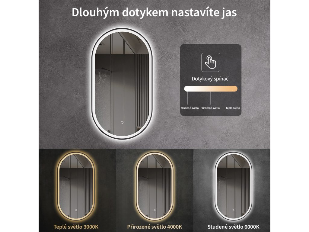 A tükör LED világítással van felszerelve, amelynek fényszíne állítható - 3000 K-től (meleg) 6000 K-ig (semleges). A színeket könnyedén válthatja a tükör felületén található érintőgombbal. Intenzív és erős fényt biztosít a részletes ápoláshoz, valamint kellemes, lágy fényt a pihenéshez. A széles színhőmérséklet-tartománynak köszönhetően könnyedén az aktuális igényeihez igazíthatja a hangulatot.