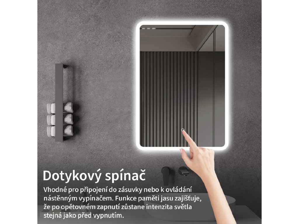 A tükör világítása egyszerűen és kényelmesen bekapcsolható a tükörlapon található kapcsoló megérintésével. Gyors világításbeállítást tesz lehetővé anélkül, hogy egy távolabbi hagyományos kapcsolóhoz kellene nyúlni.