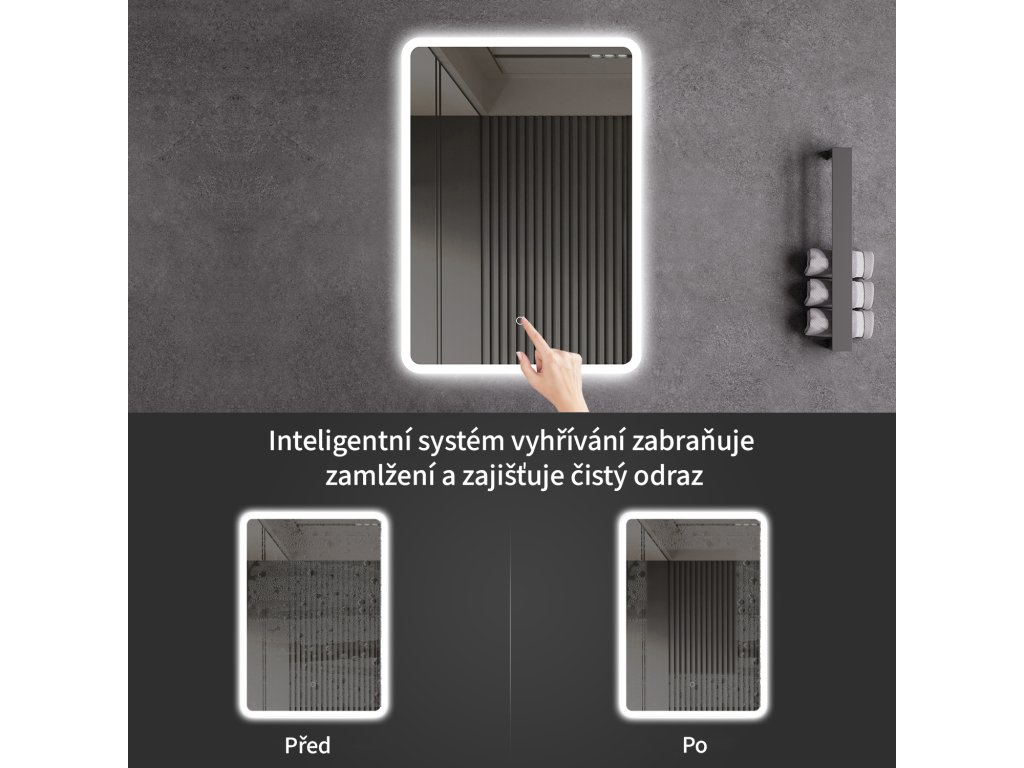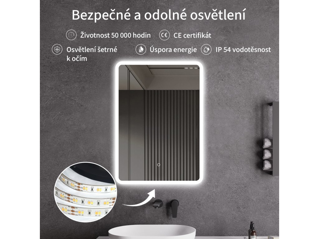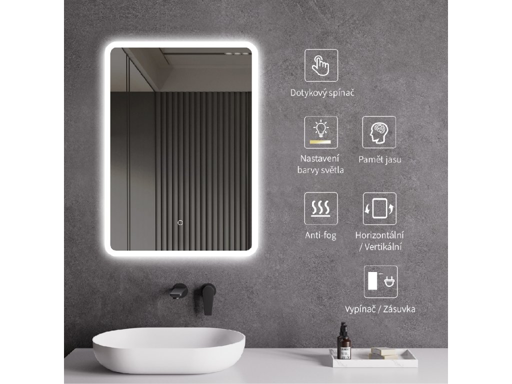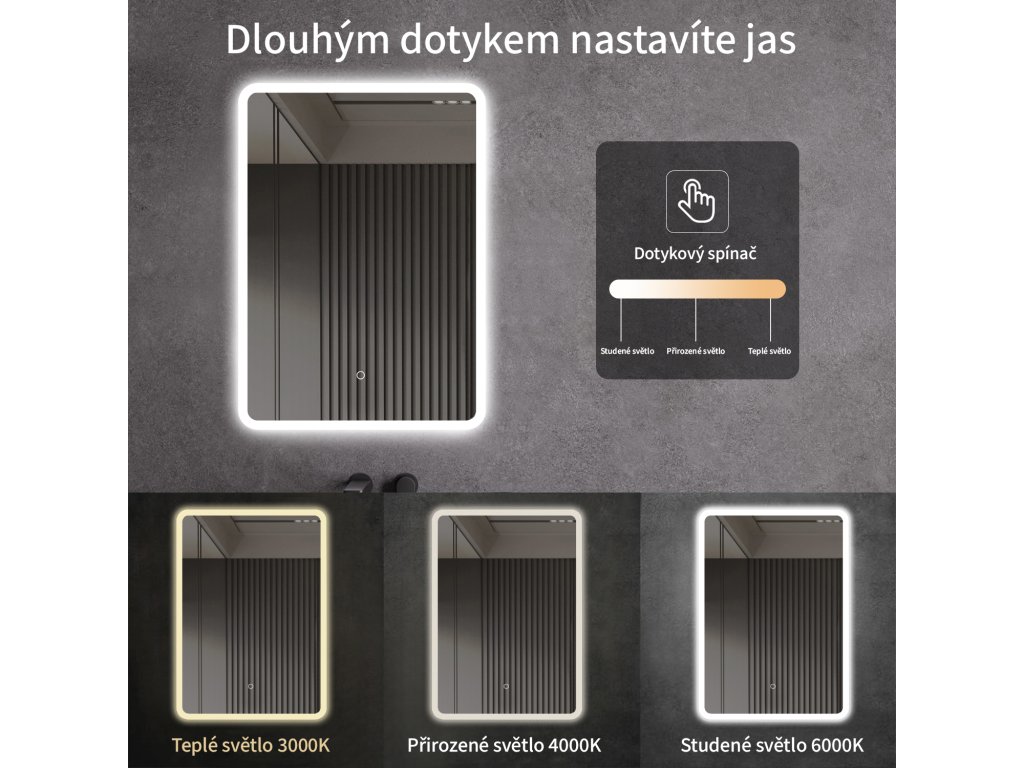 A tükör LED világítással van felszerelve, amelynek fényszíne állítható - 3000 K-től (meleg) 6000 K-ig (hideg). A színeket könnyedén válthatja a tükör felületén található érintőgombbal. Intenzív és erős fényt biztosít a részletes ápoláshoz, valamint kellemes, lágy fényt a pihenéshez. A széles színhőmérséklet-tartománynak köszönhetően könnyedén az aktuális igényeihez igazíthatja a hangulatot.