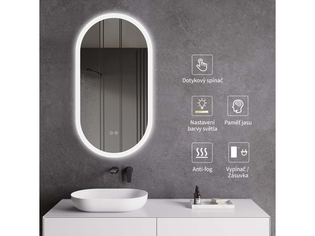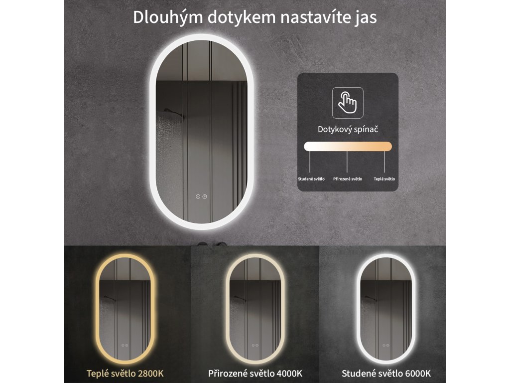 A tükör LED világítással van felszerelve, amelynek fényszíne állítható - 2800K-től (meleg) 6000K-ig (hideg). Intenzív és világos megvilágítást biztosít a részletes ápoláshoz, valamint kellemes és lágy fényt a pihenéshez. A széles színhőmérséklet-tartománynak köszönhetően a hangulatot szükség szerint beállíthatja.