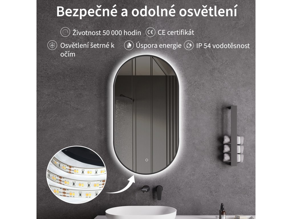 A tükör LED világítással van felszerelve, amelynek fényszíne állítható - 3000 K-től (meleg) 6000 K-ig (semleges). A színeket könnyedén válthatja a tükör felületén található érintőgombbal. Intenzív és erős fényt biztosít a részletes ápoláshoz, valamint kellemes, lágy fényt a pihenéshez. A széles színhőmérséklet-tartománynak köszönhetően könnyedén az aktuális igényeihez igazíthatja a hangulatot.