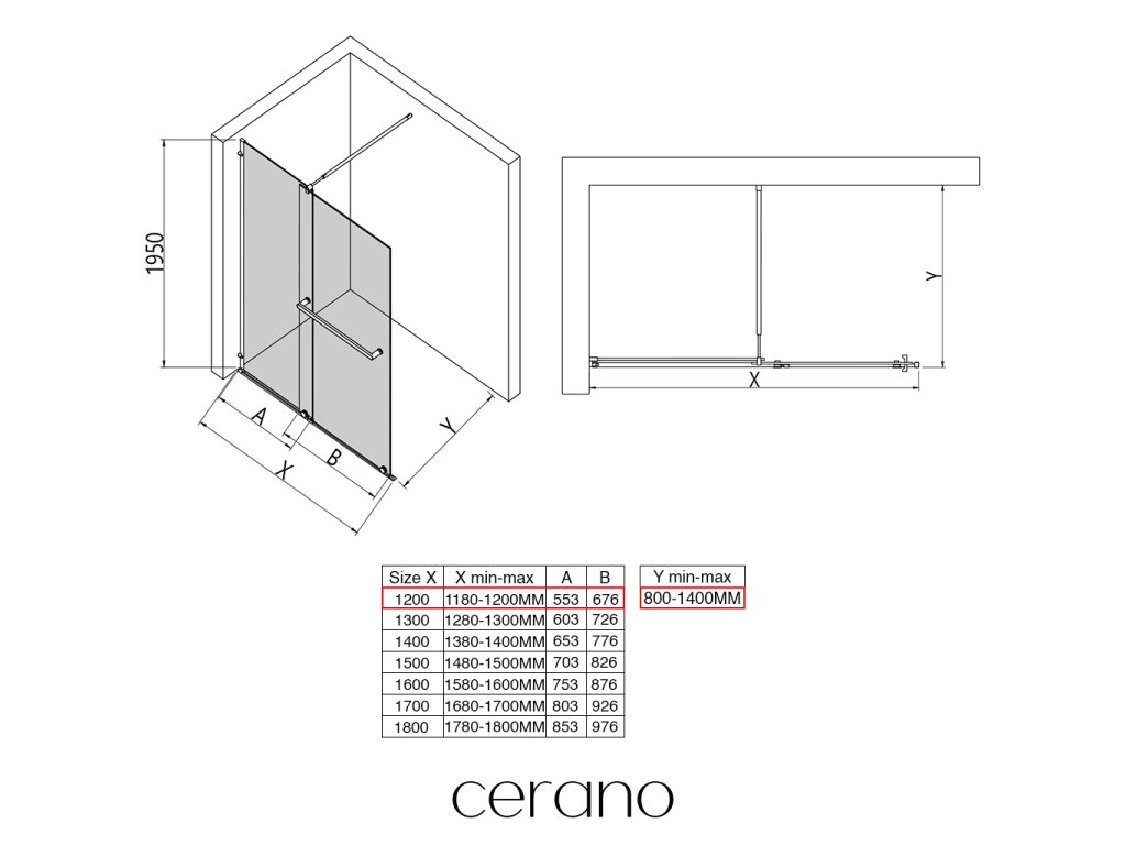 CERANO - Medin bal/jobb beépített zuhanykabin - 8 mm - matt fekete, átlátszó üveg - 120x195 cm - kétrészes tolóajtó