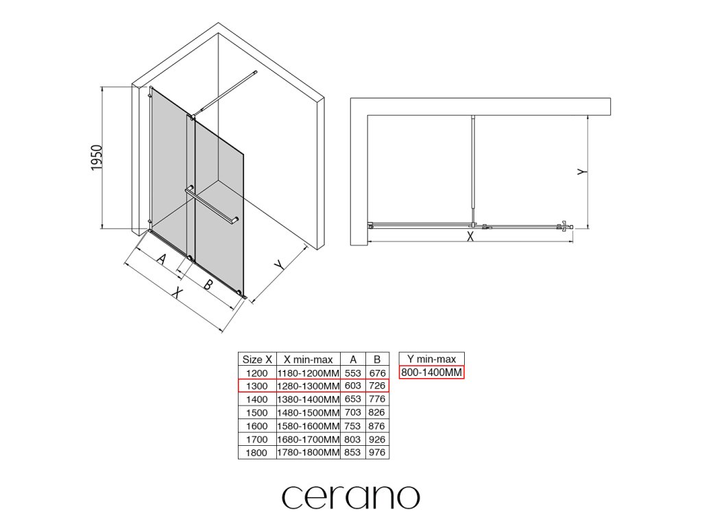 CERANO - Medin bal/jobb beépített zuhanykabin - 8 mm - matt fekete, átlátszó üveg - 130x195 cm - kétrészes tolóajtó