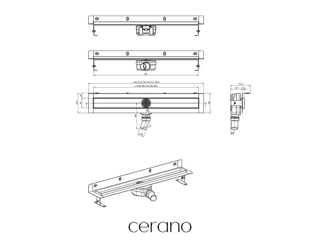 CERANO - Zuhanylefolyó falra szerelhető, 360°-ban forgatható szifonnal - DN50 - rozsdamentes acél - 92 cm