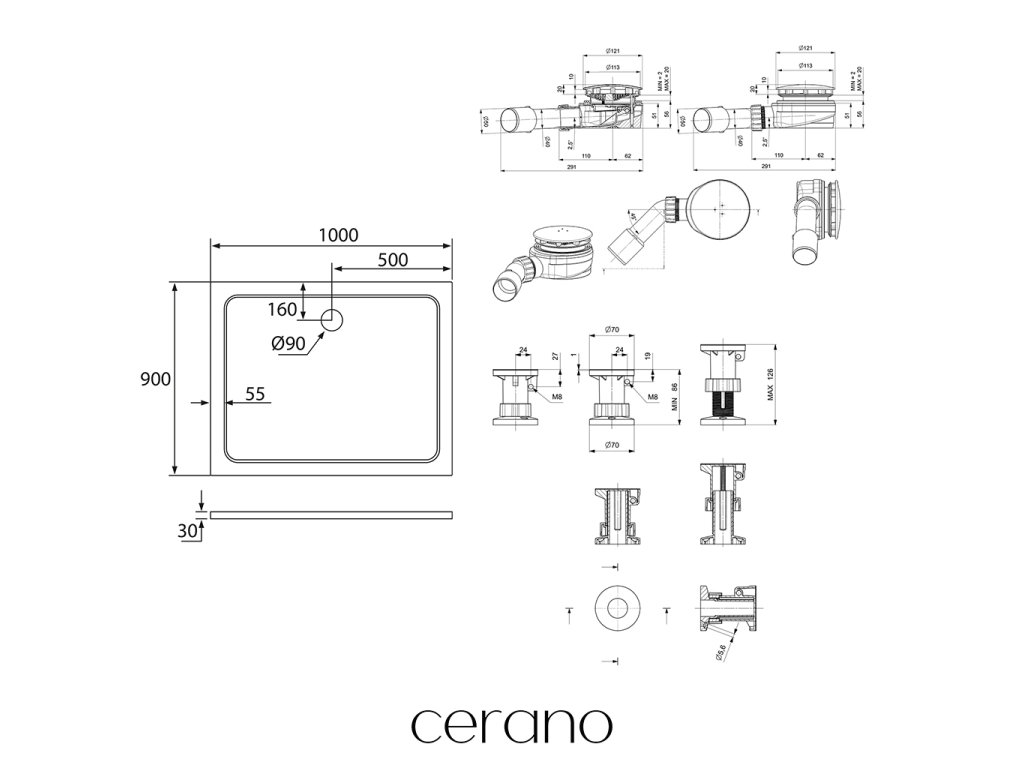 CERANO - Piato zuhanytálca szett - öntött márvány - fényes fehér - 100x90 cm + lábak + zuhanytálca szifon
