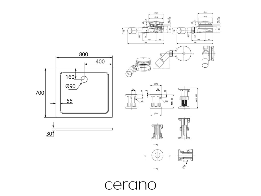 CERANO - Zuhanytálca szett Piato - öntött márvány - fehér fényes felület - 80x70 cm + lábak + zuhanytálca szifon